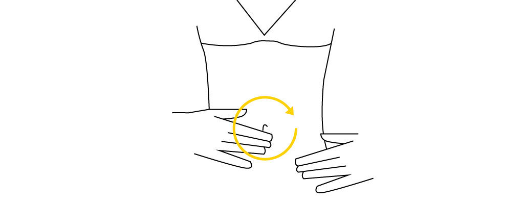 Lie comfortably on your back. Place one hand above your belly button, and place the other hand on top of the first hand. Then move your hands together in a circle with light pressure clockwise around your belly button.