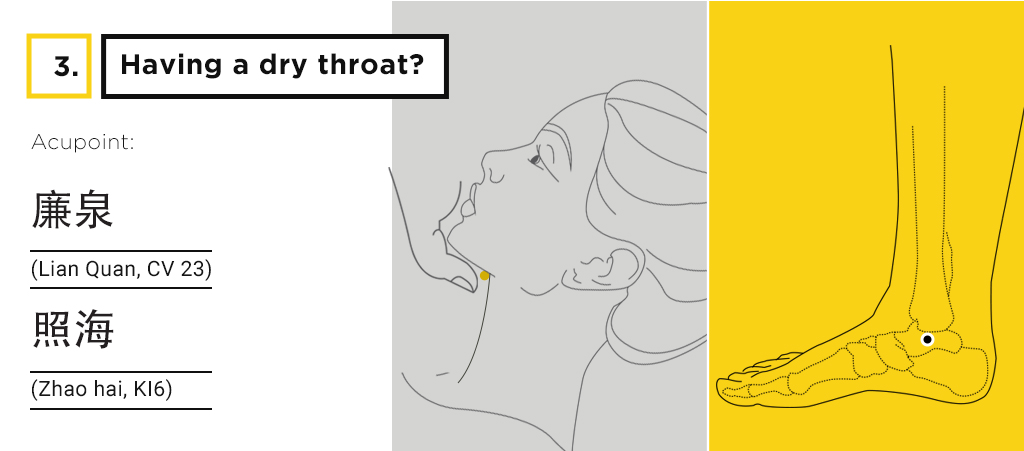 Direction: Gently massage on the point for 1 minute and swallow your saliva. You will feel the nourishment of yin in your throat.