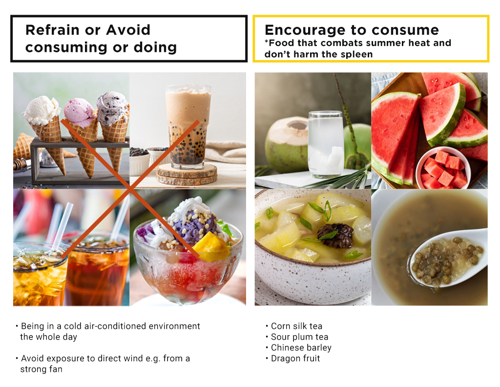 Do avoid consuming cold food like cold bubble tea, ice shaves, cold drinks or ice cream that can temporarily relieve the heat but harms your digestive process in the long run.